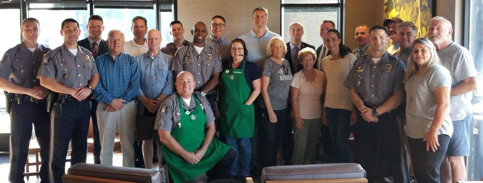 On Wednesday, October 3, 2018 from 9:00 a.m. to 10:30 a.m., Police Officers from the Wall Township Police Department held “National Coffee with a Cop” event at Starbucks located at 1913 State Highway #35. This event consisted of informal conversations in a neutral setting to build relationships between police officers and community residents and to discuss various topics of their choosing while drinking coffee and having refreshments provided for by Starbucks. The “Coffee with a Cop” event was a great opportunity for the community to gain a better understanding on how the police department operates on a daily basis and to forge the relations between the police department and the community we serve. The Wall Township Police Department would like to thank the community leaders from Grace Bible Church, West Belmar United Methodist Church and Manasquan Presbyterian Church, the Wall Township Committee (George K. Newberry and Carl Braun pictured) and all of the local business owners and community residents for their participation in this event.